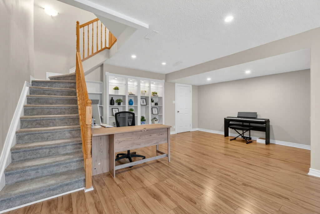 - Basement:Finished Rec Room with gas fireplace & custom built-ins. Rough-in for future bathroom