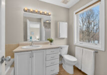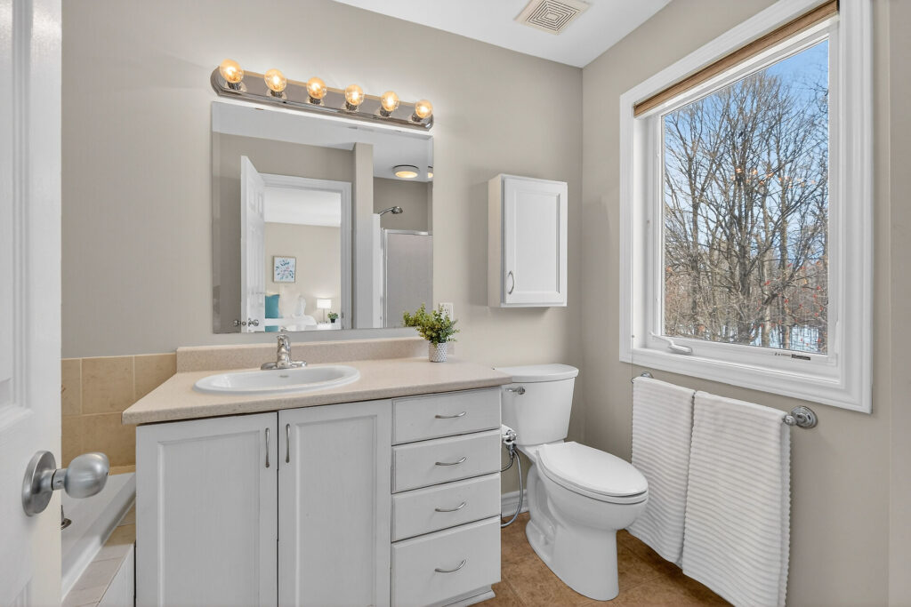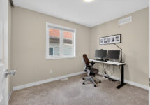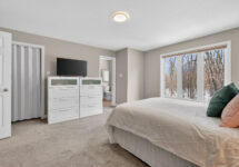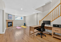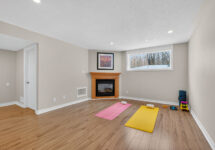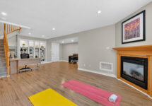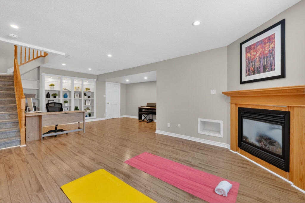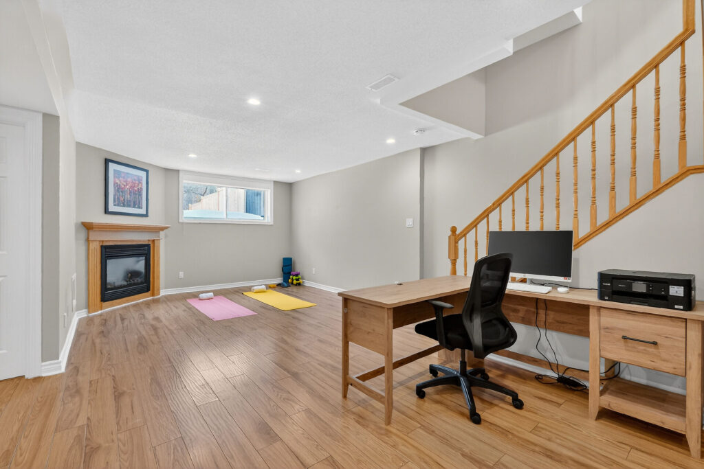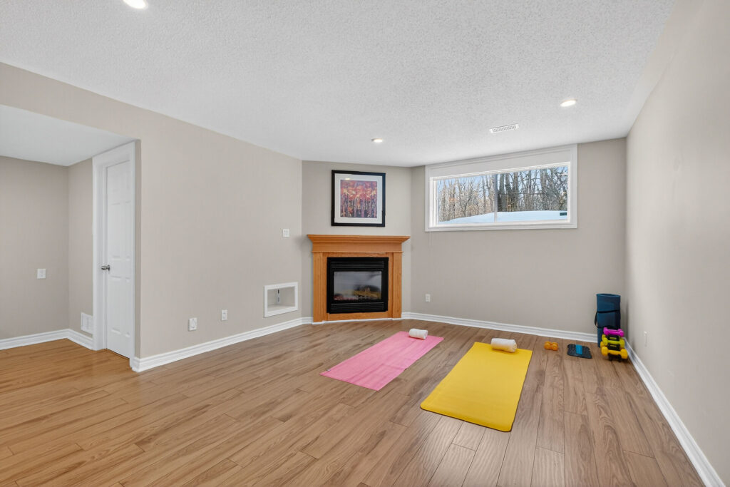 The fully finished lower level extends your living space with a bright rec room featuring large windows, a cozy gas fireplace, and custom built-ins—perfect for a home office, gym, or family hangout. A bathroom rough-in offers future flexibility.