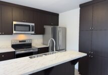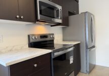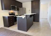 The gourmet kitchen has an abundance of counter space and cabinetry, brand new stainless appliances, and an eat-at island. The living room has large, west-facing windows.