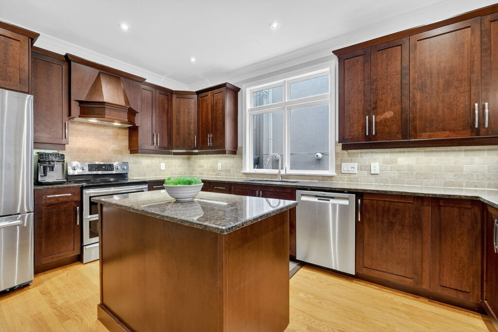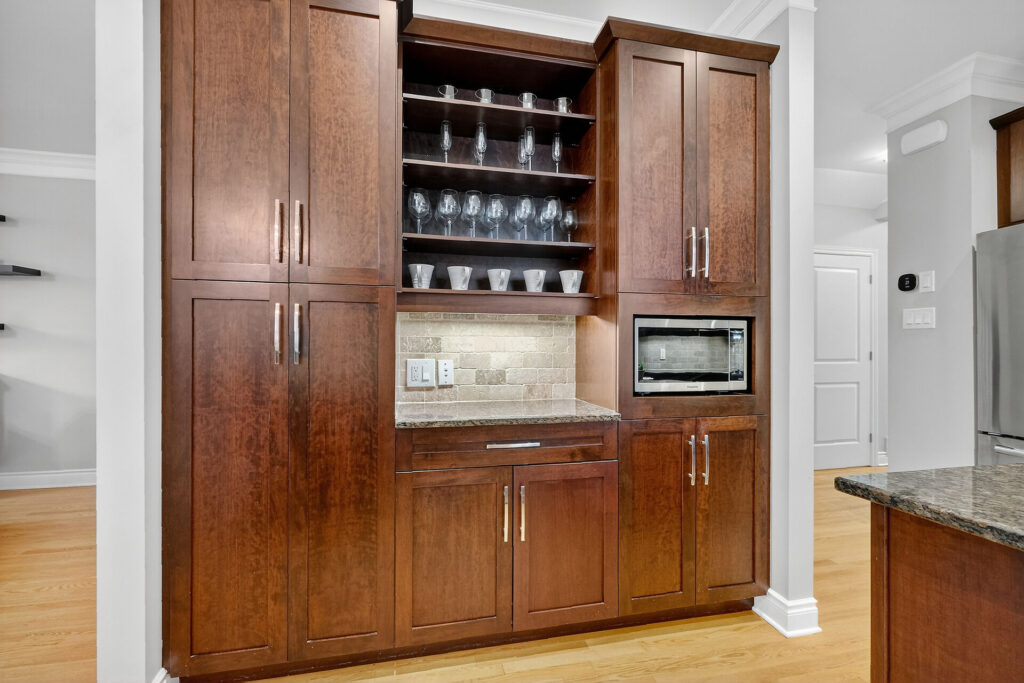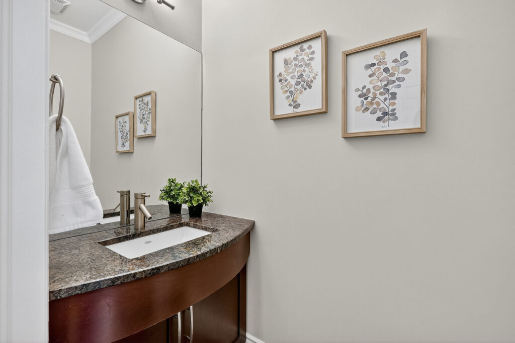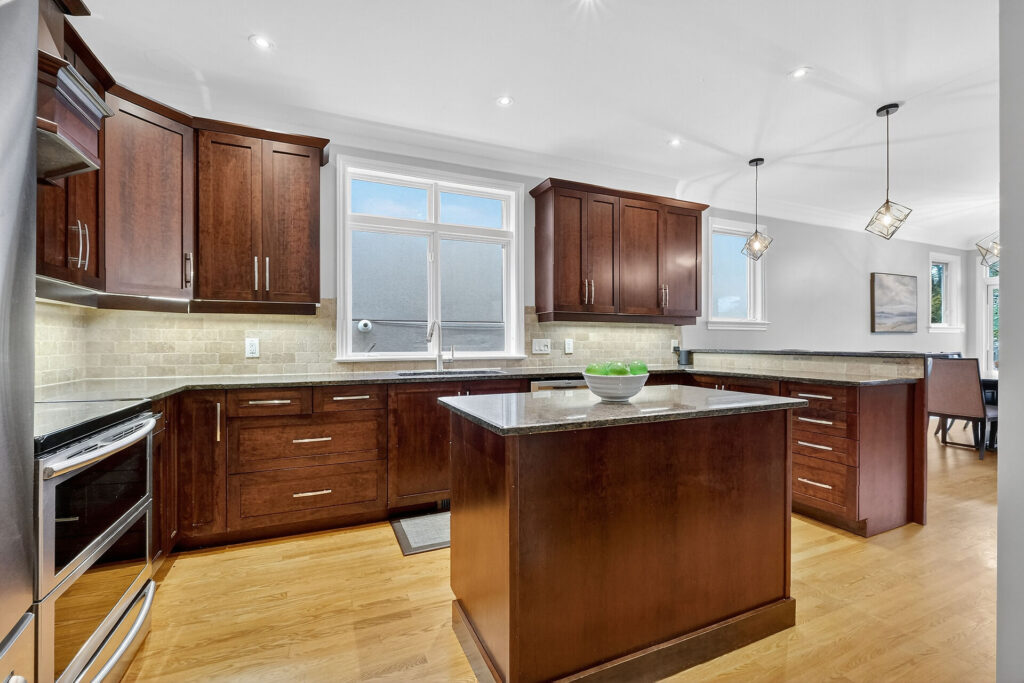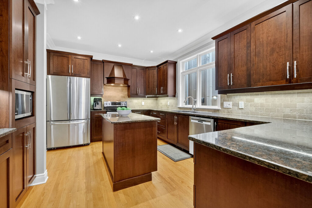 The gourmet kitchen is the heart of the home, featuring a large island, breakfast bar, coffee station, and excellent storage and prep space. A main-floor powder room and inside access to the attached garage add everyday convenience.