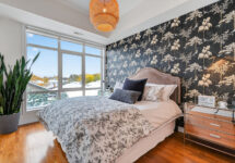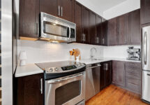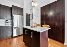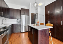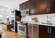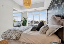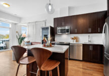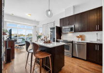 Move right in—fresh white walls, warm hardwood floors, and custom blinds throughout. The kitchen and dining area feature quartz countertops, a chic backsplash, stainless appliances, and a bonus bank of pantry cupboards surrounding a fabulous eat-at island. The open living space flows seamlessly to a private 20’ west-facing balcony—perfect for summer dining and sunset views.