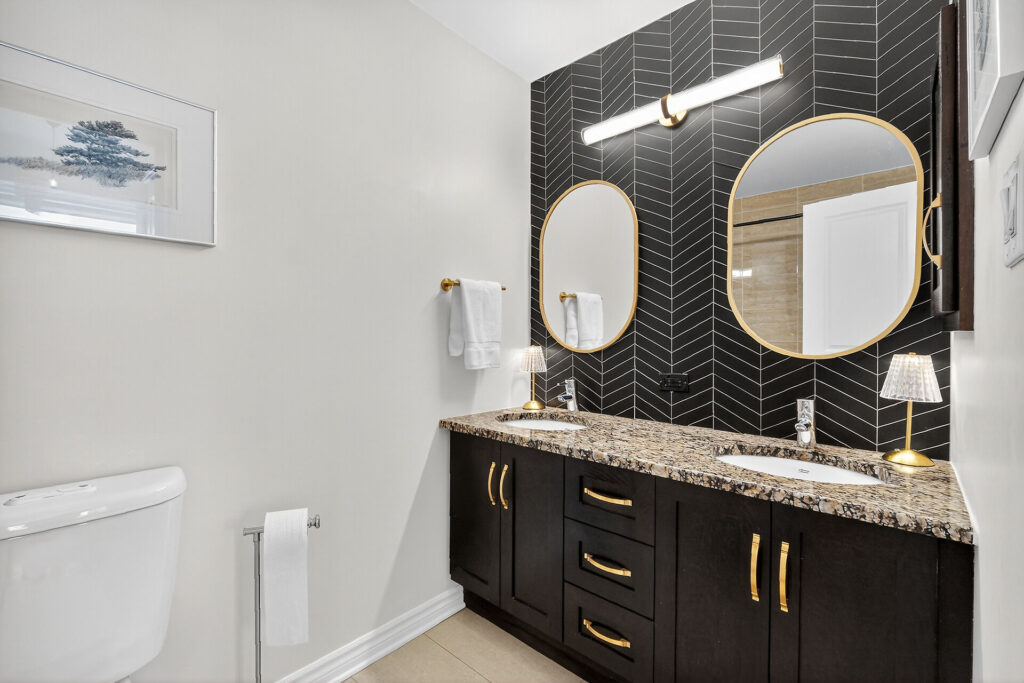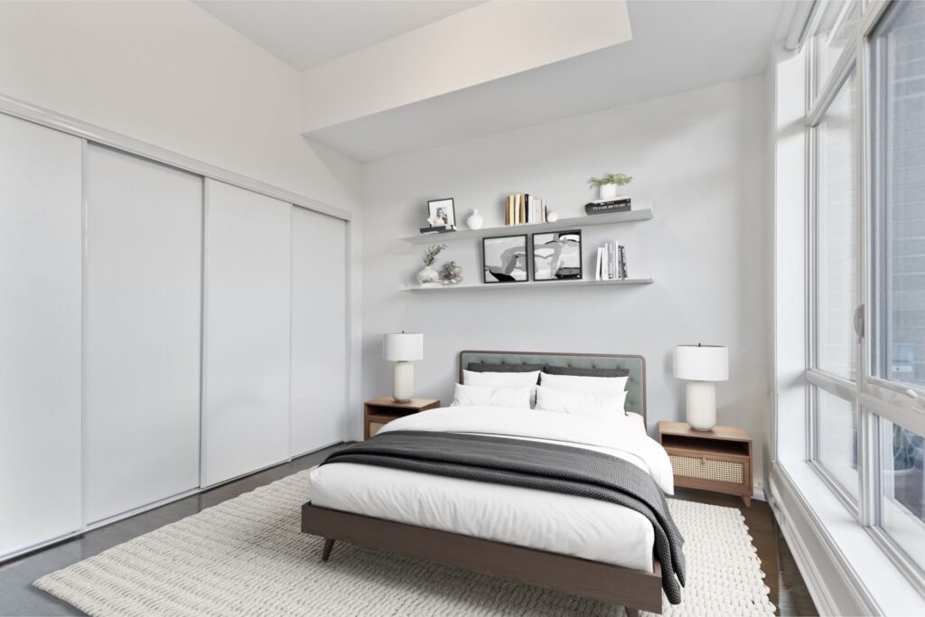 The brilliant plan includes two private bedroom zones, each with sliding-door access: the primary easily accommodates a king bed and offers double closets plus a 5-piece ensuite with double vanity. The second bedroom doubles beautifully as a guest suite, office, or formal dining area.