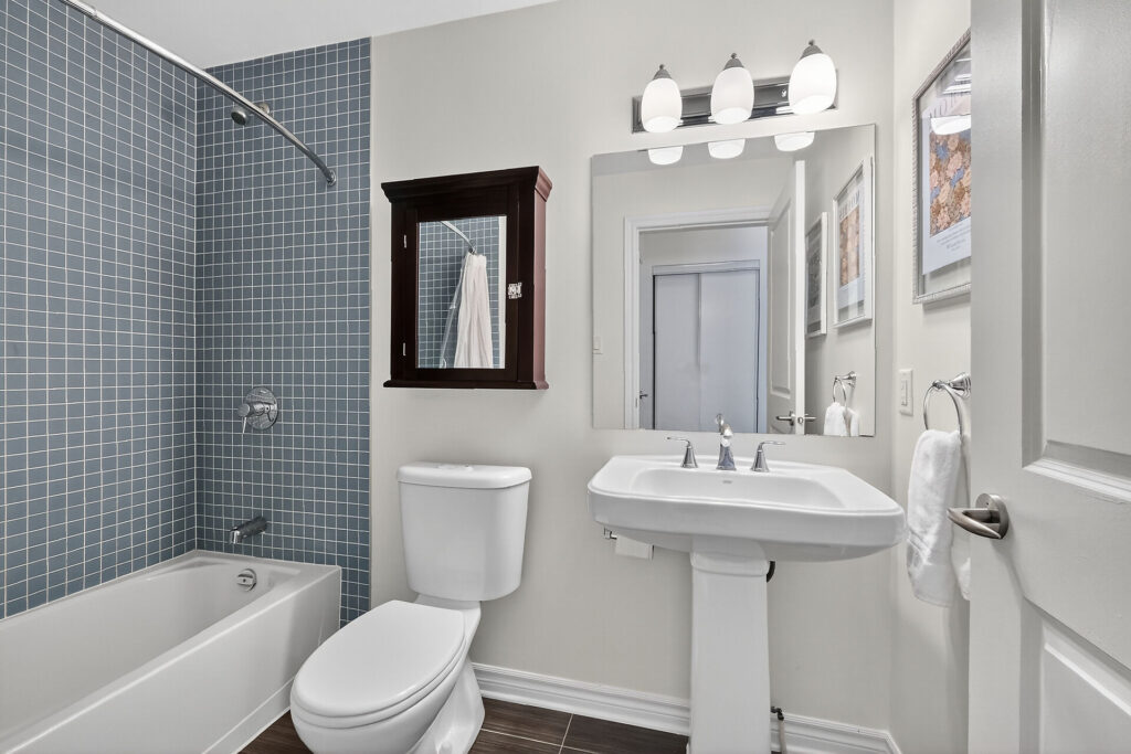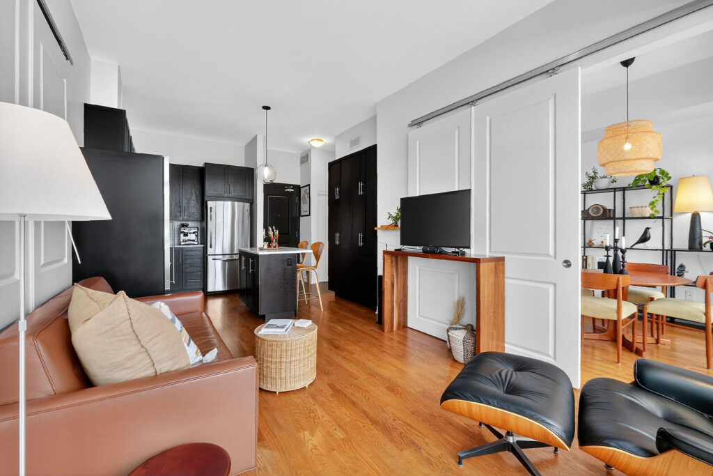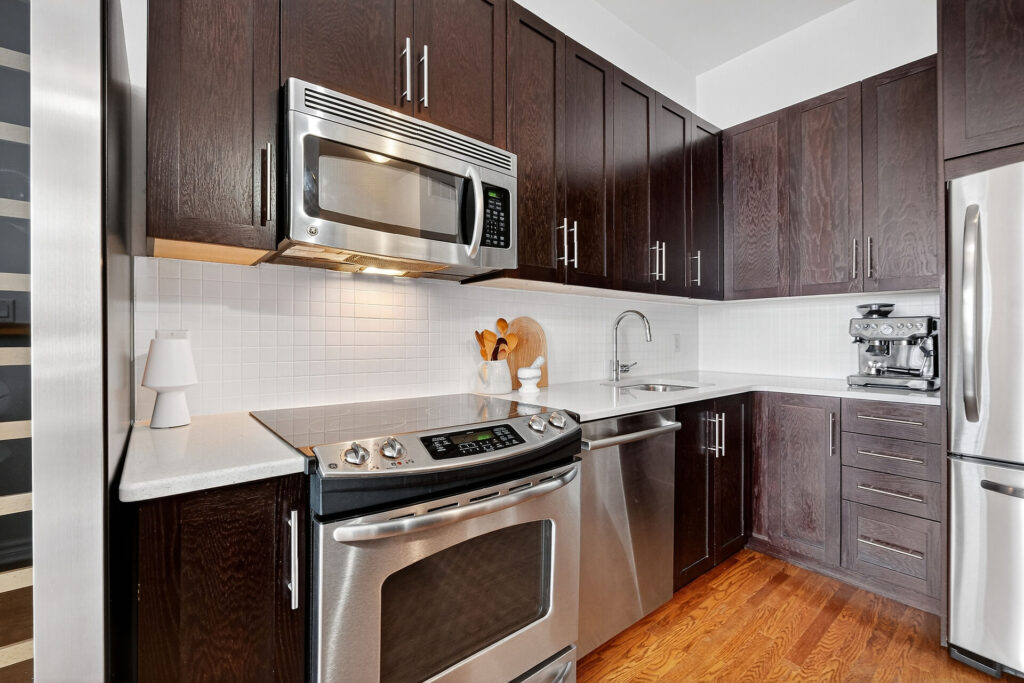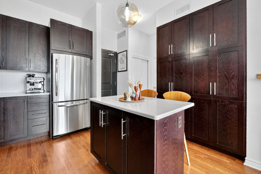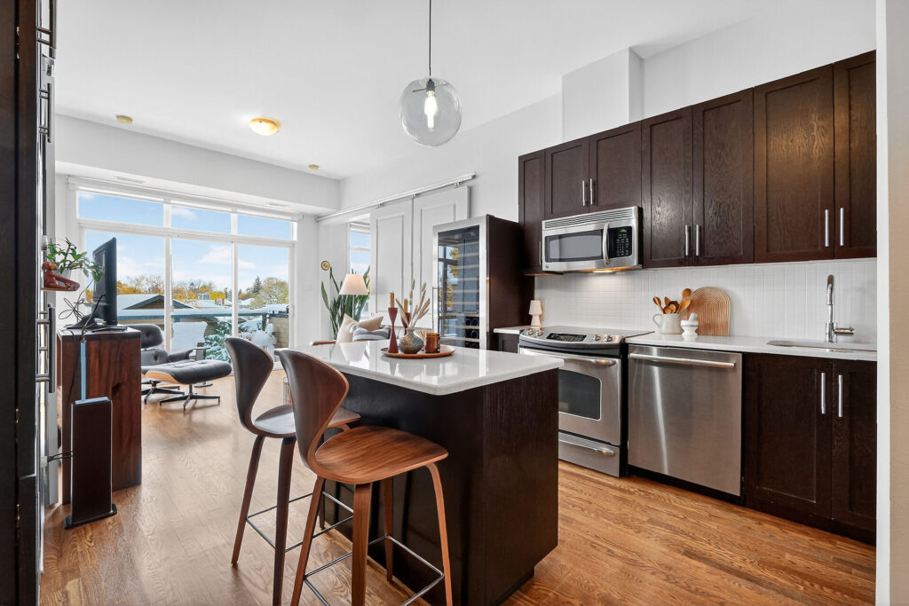 Move right in—fresh white walls, warm hardwood floors, and custom blinds throughout. The kitchen and dining area feature quartz countertops, a chic backsplash, stainless appliances, and a bonus bank of pantry cupboards surrounding a fabulous eat-at island. The open living space flows seamlessly to a private 20’ west-facing balcony—perfect for summer dining and sunset views.